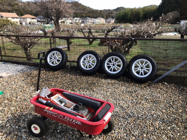 帰ってからプリウスのタイヤをスタッドレスに交換した。
